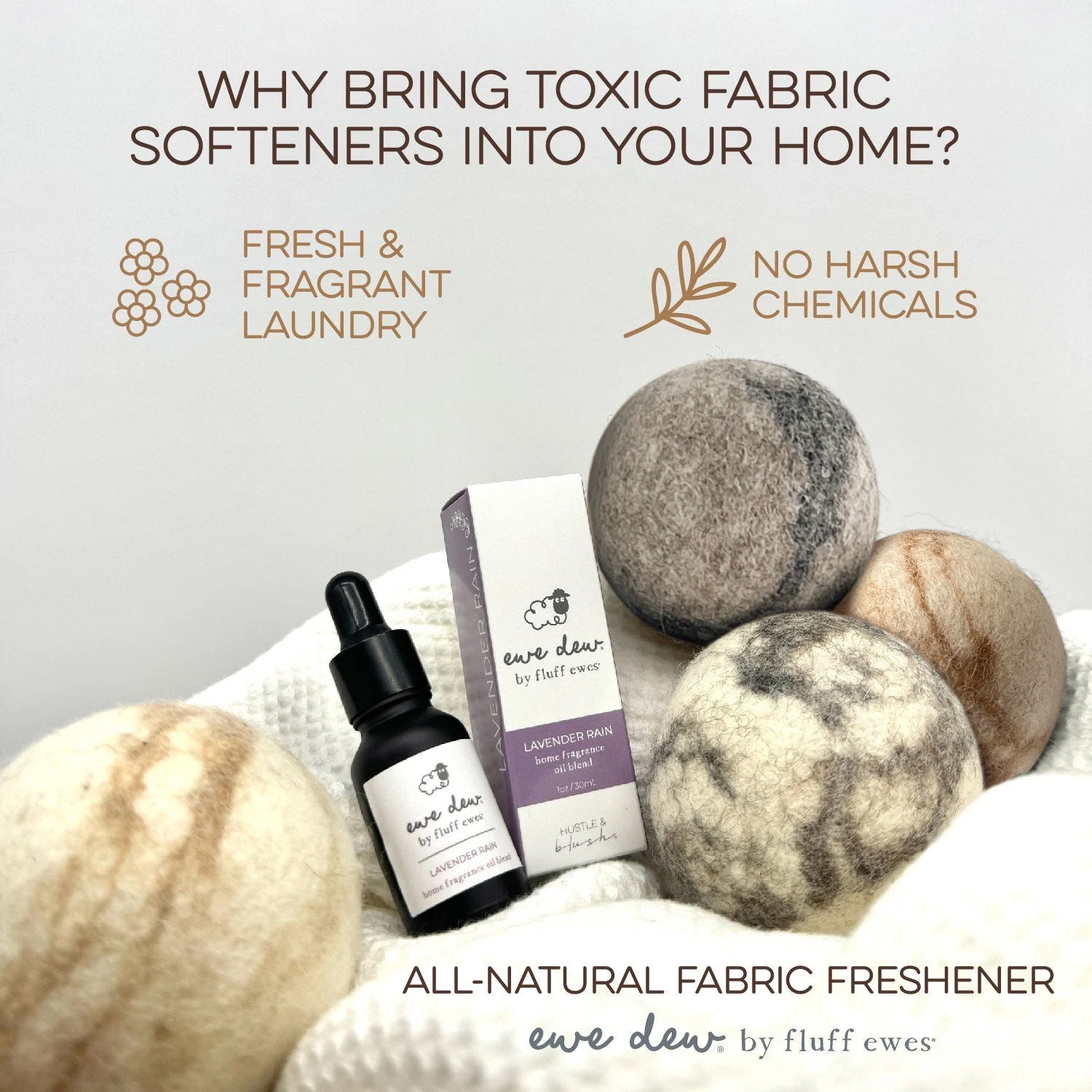 Toss 3 dryer balls into small loads, or all 6 for large loads. For a fresh, natural scent, add 2–3 drops of your favorite Ewe Dew essential oil to each ball before drying.
