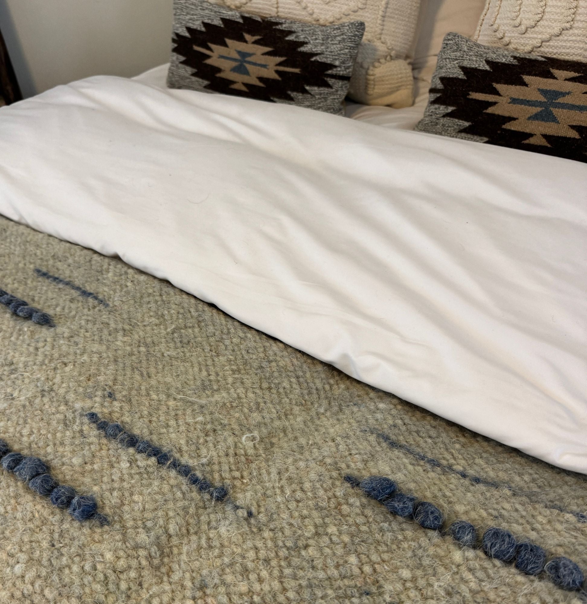 - Breathable Warmth: Wool naturally regulates temperature, retaining warmth when nights are cool and allowing airflow in heavy air. With its substantial weight, the Horoshy is especially suited for cooler climates and seasons, adding grounding greens and neutral tones to the sleep environment.