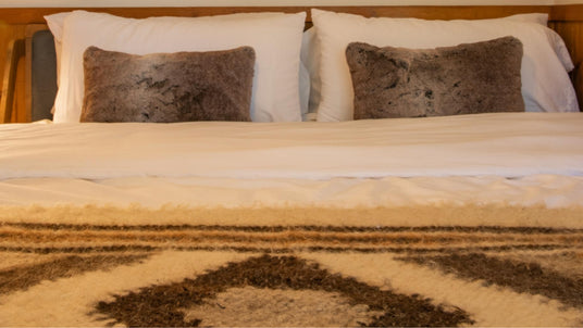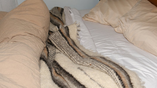 Gentle care goes a long way. Wool is naturally hypoallergenic and antimicrobial, so it doesn’t need frequent washing like other fabrics. We suggest spot-cleaning when possible and giving your blanket a good shake now and then to keep the fibers lively. If a deeper clean is needed, our blankets and bed runners can be machine-washed in cold water on the gentle cycle using a natural detergent, or even a simple mix of vinegar and baking soda. To dry, hang outside or use the delicate setting in the dryer. They can also be dry cleaned. When not in use, store your blanket in the linen bag that comes with it.