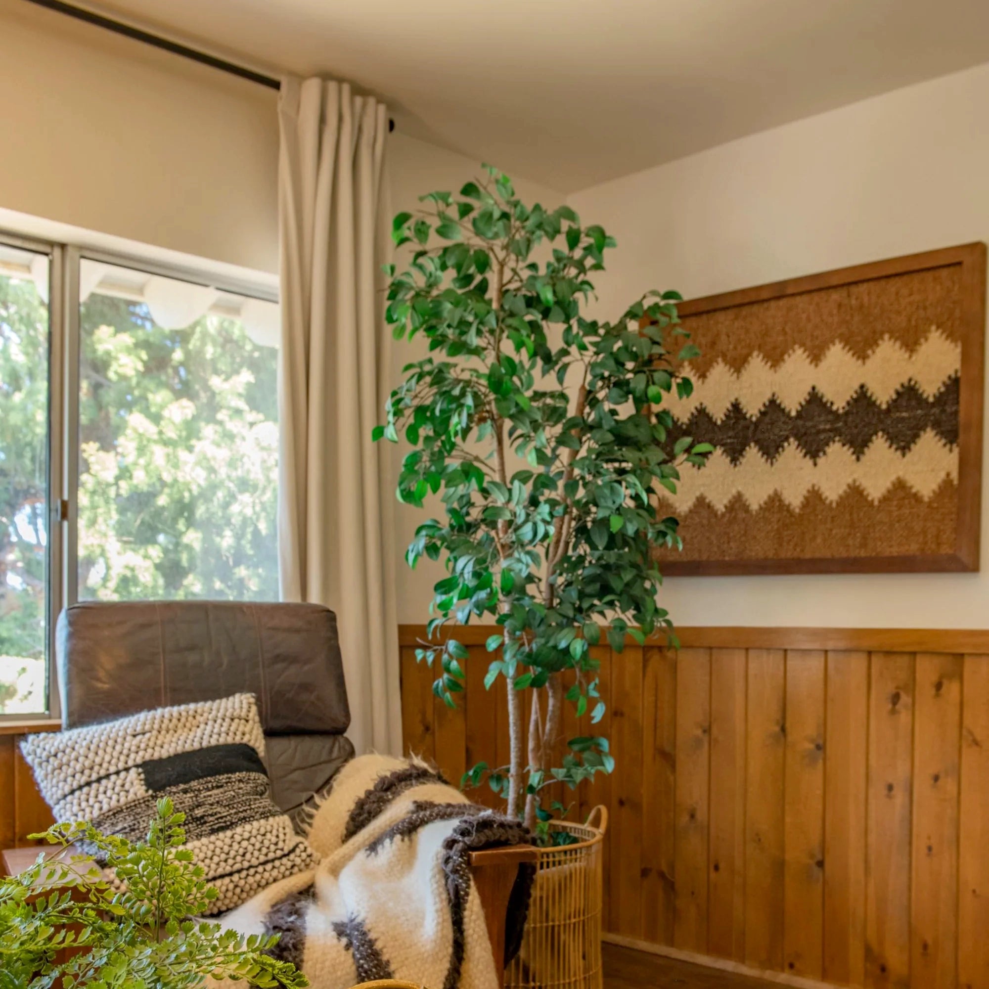 As a focal piece, display it above a console, headboard, or fireplace to highlight its balanced geometry and organic texture. The cedar frame’s natural tone complements light or dark walls, adding warmth to neutral wall decor.