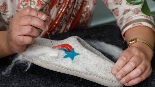 Yes. Each pair is hand-felted and stitched by female artisans in Nepal using traditional techniques. The rainbow and star motifs are individually needled by hand, ensuring every pair is unique.
