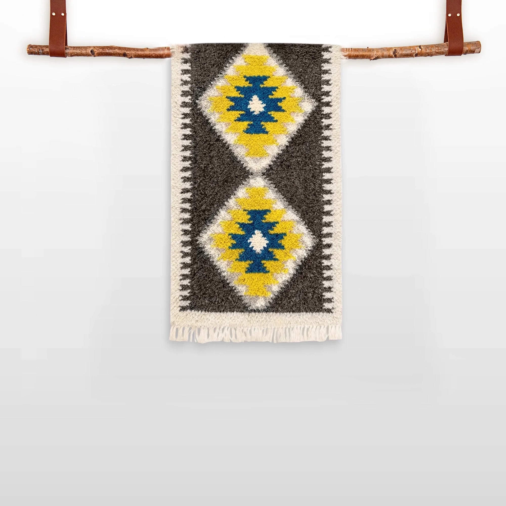 The Mriya wall hanging arrives ready for display. As a centerpiece, hang it above a sofa, bed, or console to create uplifting wall decor that draws the eye upward. The canary and peacock tones infuse color into neutral interiors, while the natural wool texture adds warmth to rustic or modern spaces. In creative or meditative areas, its balanced geometry and tranquil hues inspire focus and reflection, perfect for those who appreciate art tapestries that blend design with feeling. Gently dust with a soft brush, or air occasionally to refresh the fibers. Avoid prolonged sunlight to preserve its natural tones and depth.