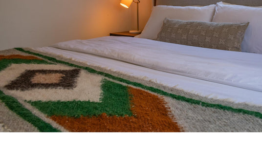 Gentle care goes a long way. Wool is naturally hypoallergenic and antimicrobial, so it doesn’t need frequent washing like other fabrics. We suggest spot-cleaning when possible and giving your blanket a good shake now and then to keep the fibers lively. If a deeper clean is needed, our blankets and bed runners can be machine-washed in cold water on the gentle cycle using a natural detergent, or even a simple mix of vinegar and baking soda. To dry, hang outside or use the delicate setting in the dryer. They can also be dry-cleaned. When not in use, store your blanket in the linen bag the blanket comes with.